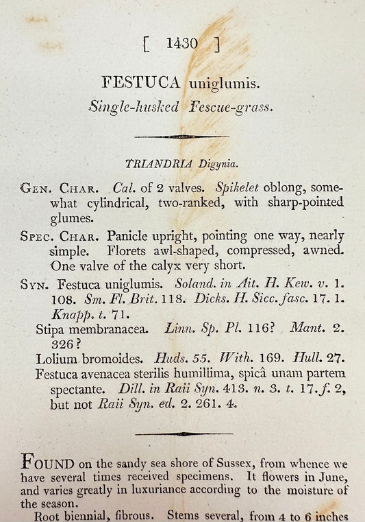 Antique Print - Sowerby - Festuca Uniglumis - Single-husked Fescue-grass - F1