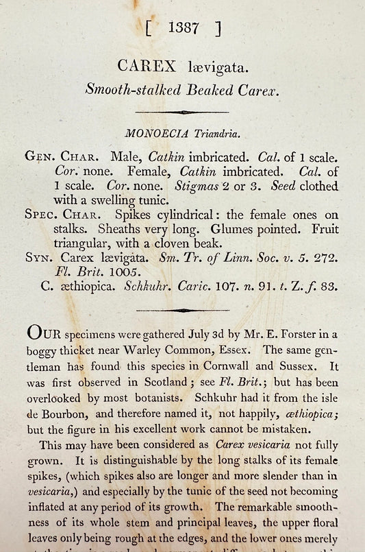 Antique Print - Sowerby - Carex Lævigata - Smooth-stalked Beaked Carex - F1