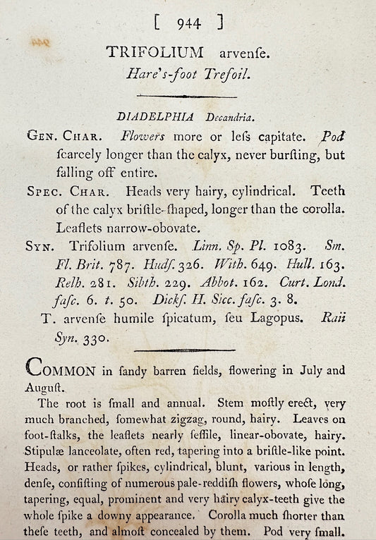 Antique Print - James Sowerby - Trifolium Arvense - Hare's-foot Trefoil - F1