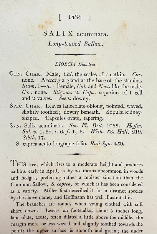 Antique Print - James Sowerby - Salix Petiolaris - Dark Long-leaved Willow - F1
