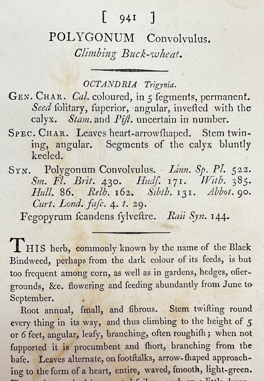 Antique Print - James Sowerby - Polygonum Convolvulus - Climbing Buck-wheat - F1