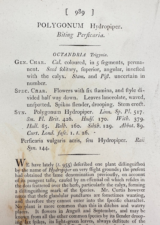Antique Print - James Sowerby - Polygonum Hydropiper - Biting Perficaria - F1