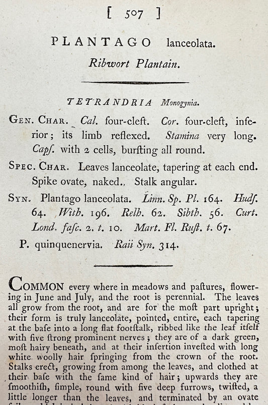 Antique Print - James Sowerby - Plantago Lanceolata - Ribwort Plantain - F1