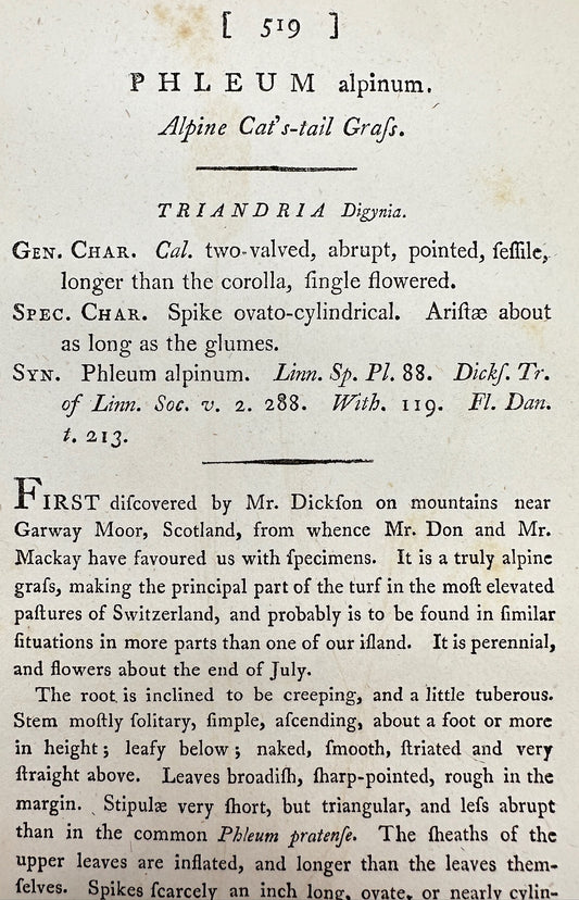Antique Print - James Sowerby - Phleum Alpinum - Alpine Cat's-tail Grafs - F1