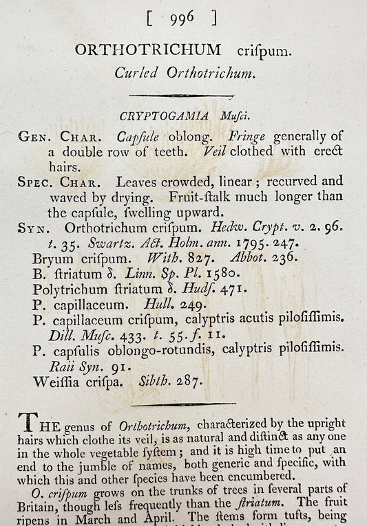 Antique Print - James Sowerby - Orthotrichum Criſpum - Curled Orthotrichum - F1