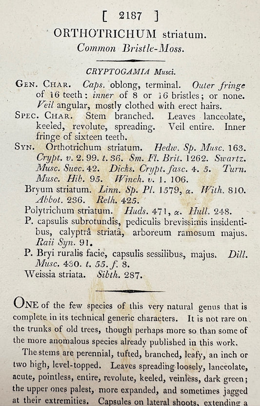 Antique Print - James Sowerby - Orthotrichum Striatum - Common Bristle-Moss - F1