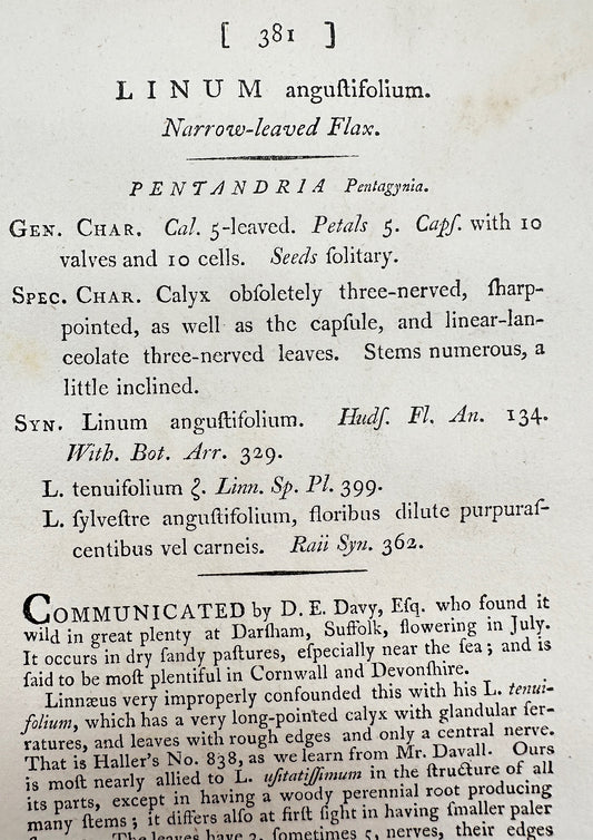 Antique Print - James Sowerby - Linum Angustifolium - Narrow-leaved Flax - F1