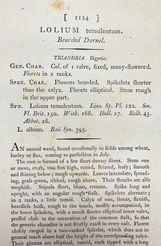Antique Print - James Sowerby - Lolium Temulentum - Bearded Darnel - F1