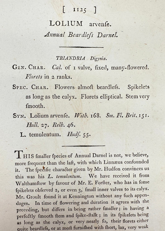 Antique Print - James Sowerby - Lolium Arvense - Perennial Ryegrass - F1
