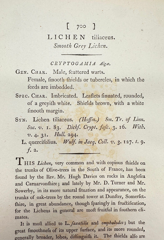 Antique Print - James Sowerby - Lichen Tiliaceus - Smooth Grey Lichen - F1