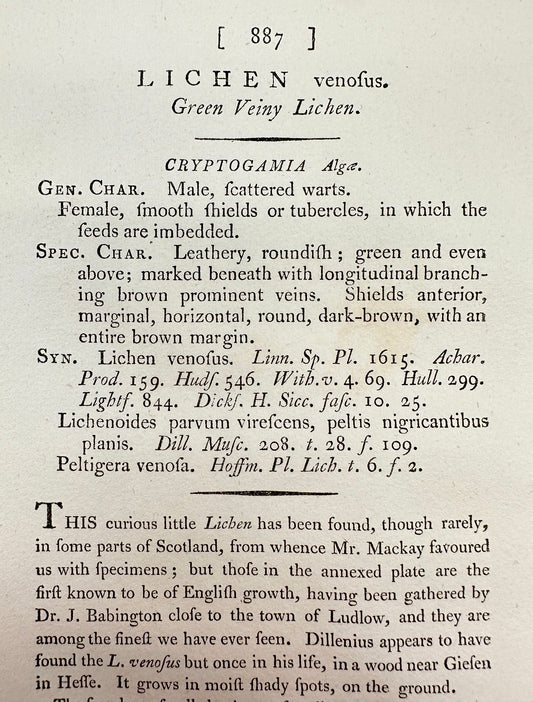 Antique Print - James Sowerby - Lichen Venofus - Green Veiny Lichen - F1
