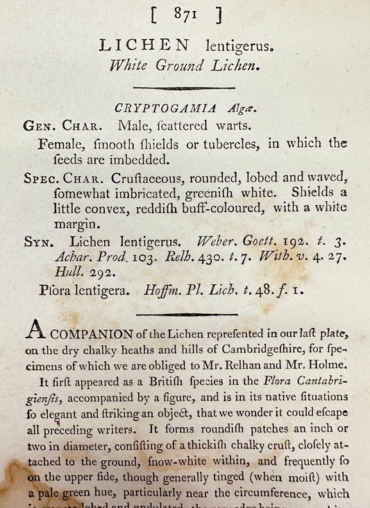 Antique Print - James Sowerby - Lichen Lentigerus - White Ground Lichen - F1