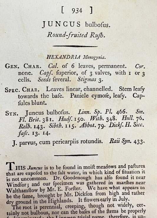 Antique Botanical Print - James Sowerby - Juncus Bulbofus - Bulbous Rush - F1