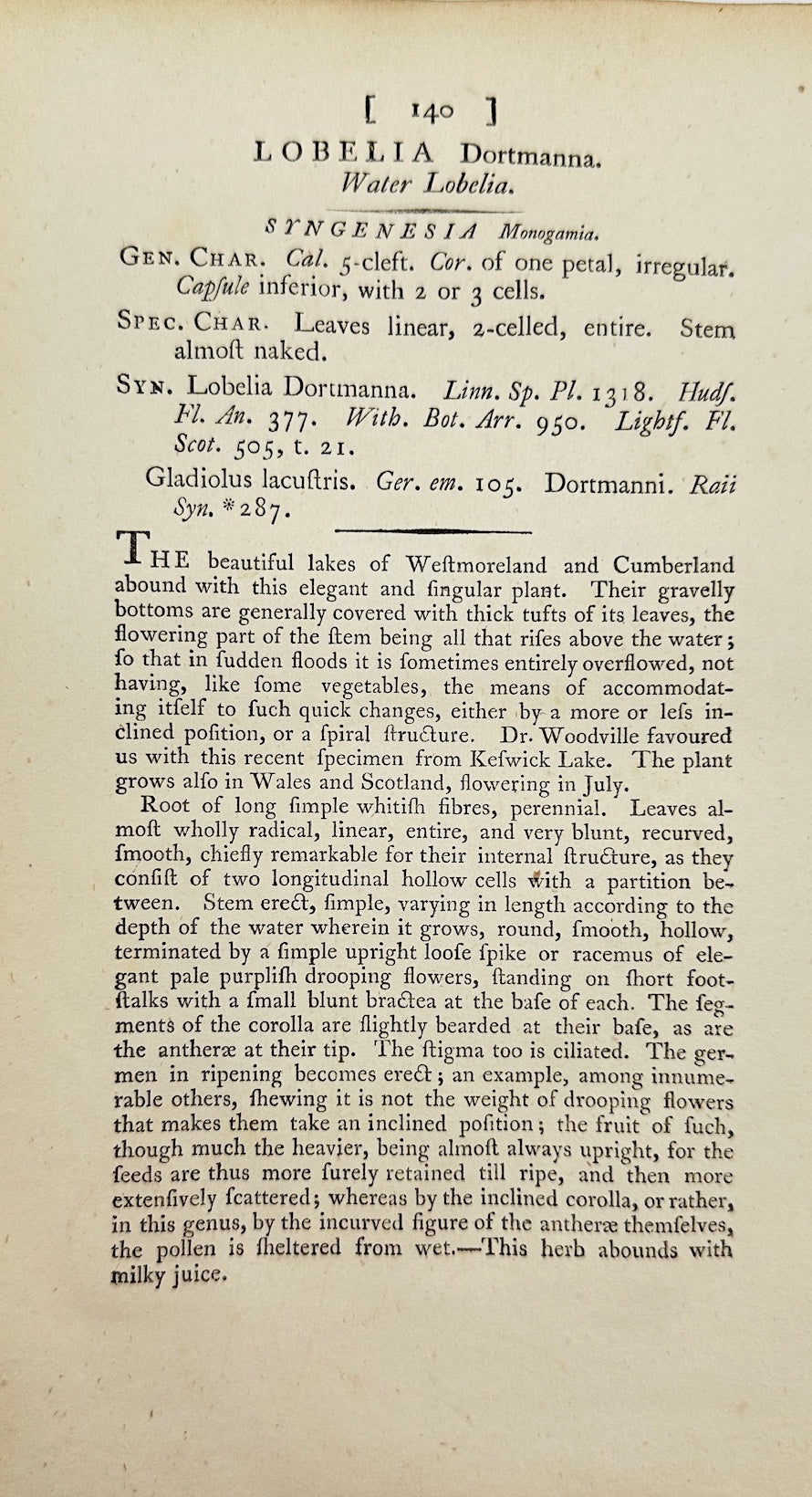 Antique Botanical Print - James Sowerby - Lobelia Dortmanna - Water Lobelia - F1