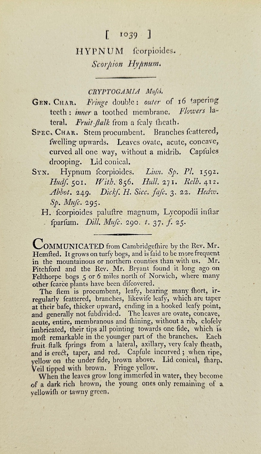 Antique Print - James Sowerby - Hypnum Fcorpioides - Scorpion Hypnum - F1