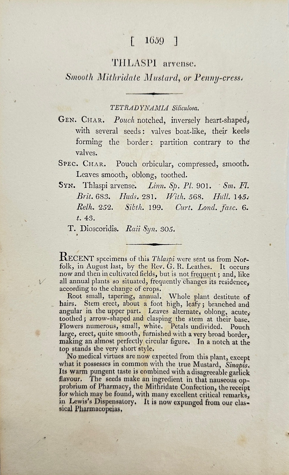 Antique Print - James Sowerby - Thlaspi Arvense - Field Pennycress - F1