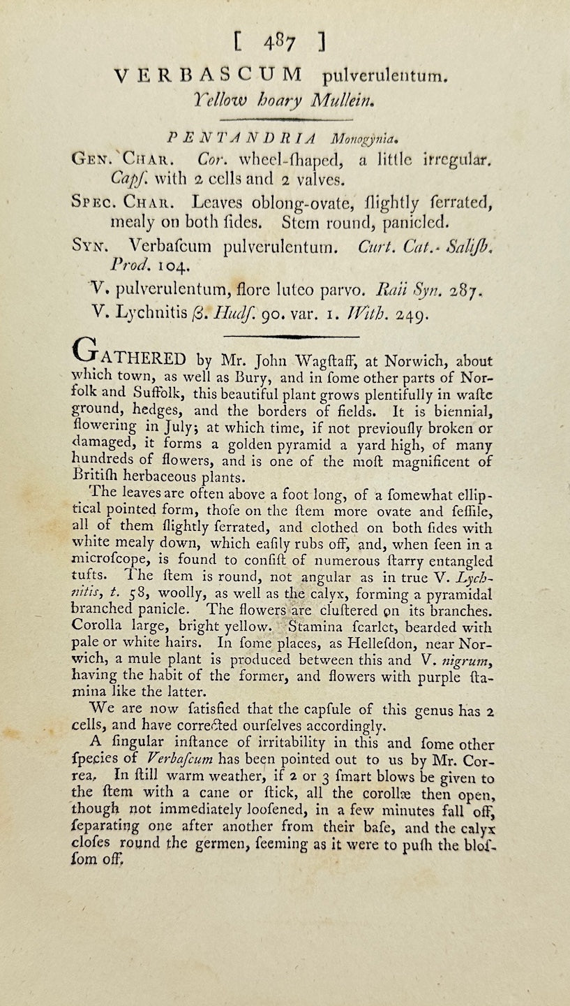 Antique Print - James Sowerby - Verbascum Pulverulentum - Dusty Mullein - F1
