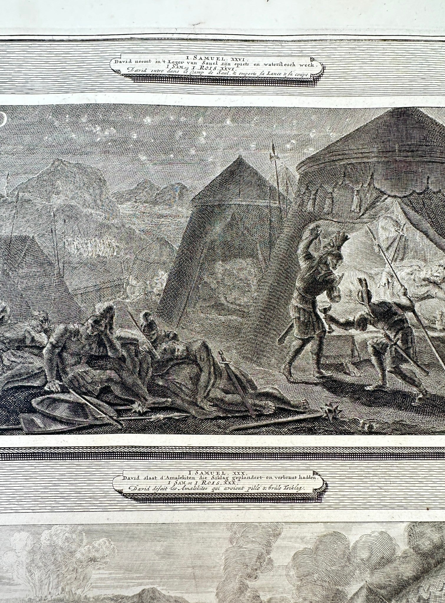 This magnificent biblical engraving is from Pierre Mortier’s ”Histoire du Vieux et du Nouveau Testament” (History of the Old and New Testaments). The work is published in Amsterdam, 1700s.