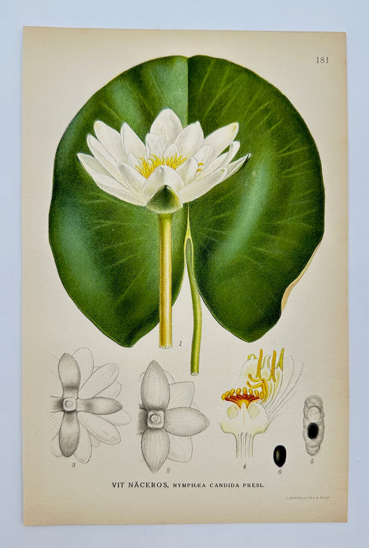 Antique Print - Carl Lindman - White Water Lily - Nymphaea Candida - F4