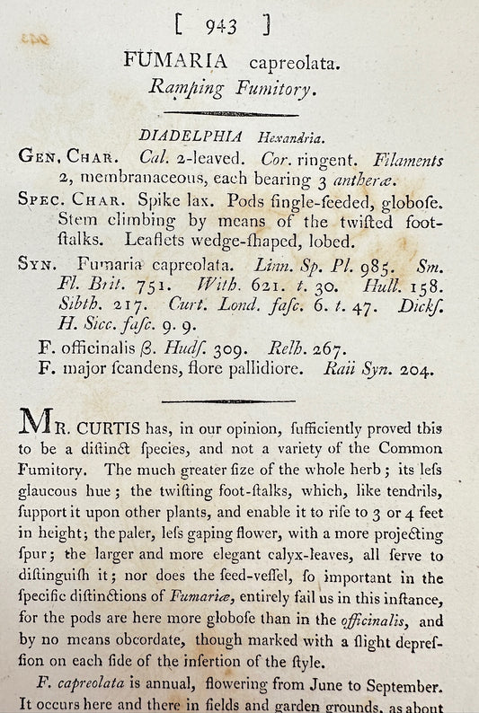 Antique Print - James Sowerby - Fumaria Capreolata - Ramping Fumitory - F1