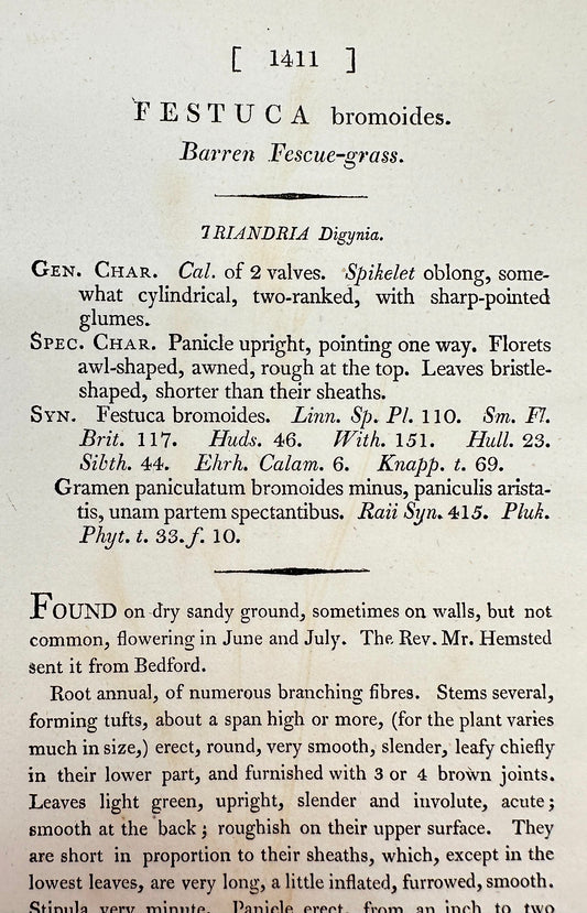 Antique Print - James Sowerby - Festuca Bromoides - Barren Fescue-grass - F1