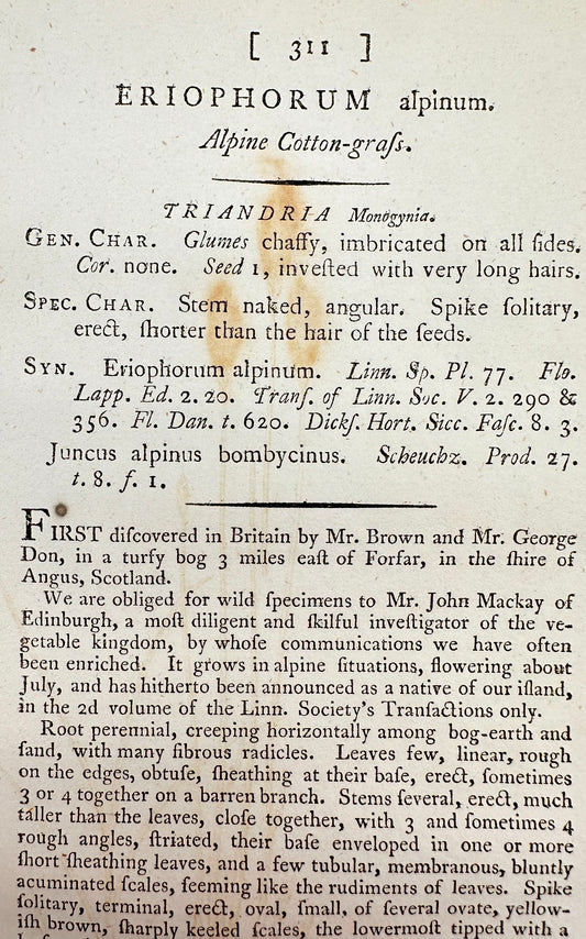 Antique Print - James Sowerby - Eriophorum Alpinum - Alpine Cotton-grafs - F1