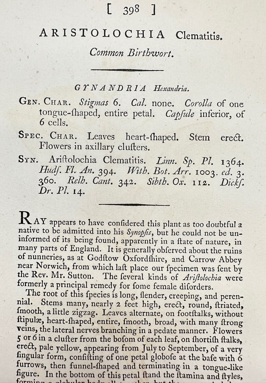 Antique Print - James Sowerby - Aristolochia Clematitis - Common Birthwort - F1
