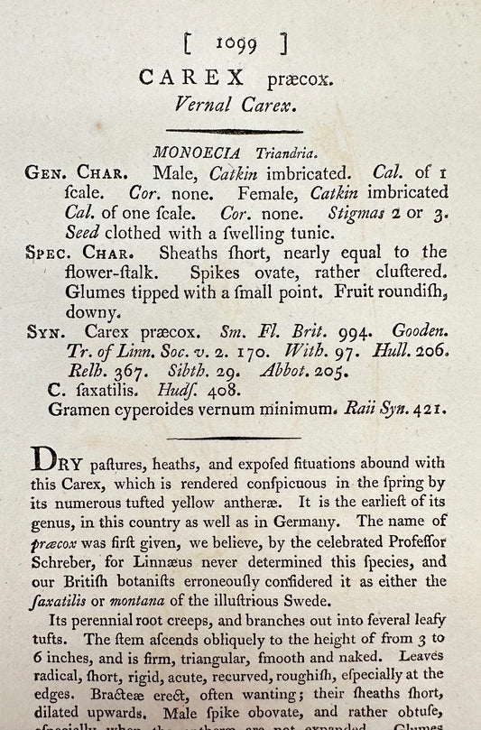 Antique Botanical Print - James Sowerby - Carex Praecox - Vernal Carex - F1