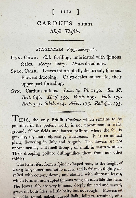 Antique Botanical Print - James Sowerby - Carduus Nutans - Musk Thistle - F1