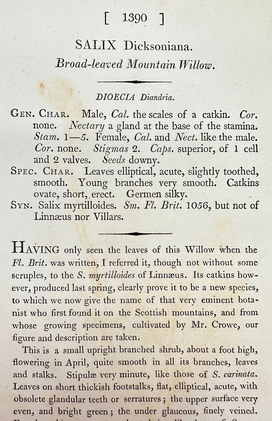 Antique Print - Sowerby - Salix Dicksoniana - Broad-leaved Mountain Willow - F1