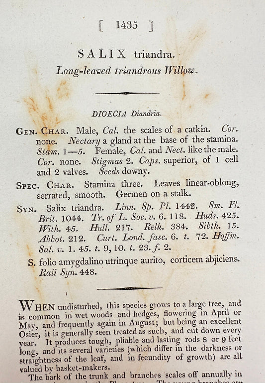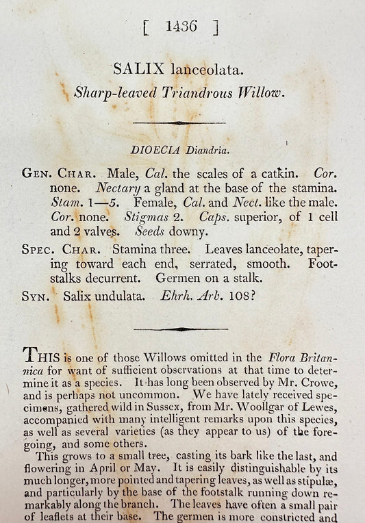 Antique Print - Sowerby - Salix Lanceolata - Sharp-leaved Triandrous Willow - F1