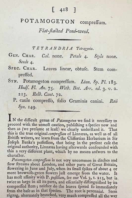 Antique Print - Sowerby - Potamogeton Compressum - Flat-ftalked Pond-weed - F1