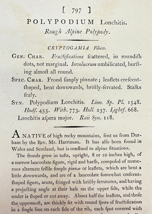 Antique Print - Sowerby - Polypodium Lonchitis - Rough Alpine Polypody - F1