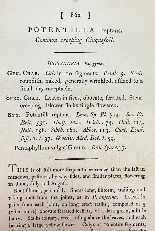 Antique Print - Sowerby - Potentilla Reptans - Common creeping Cinquefoil - F1