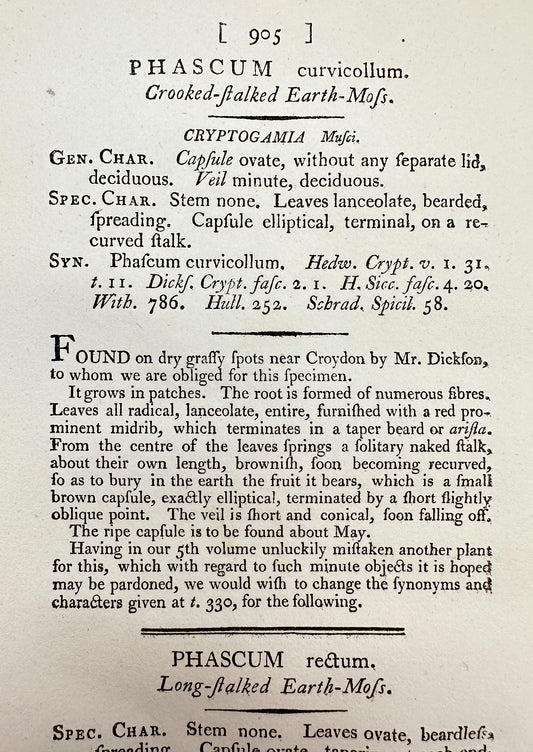 Antique Print - Sowerby - Phascum Curvicollum - Crooked-Stalked Earth-Mofs - F1