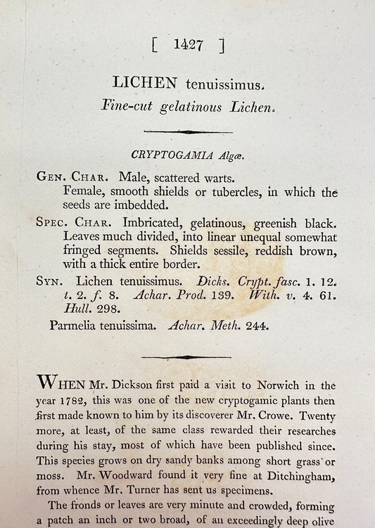 Antique Print - Sowerby - Lichen Tenuissimus - Fine-cut Gelatinous Lichen - F1