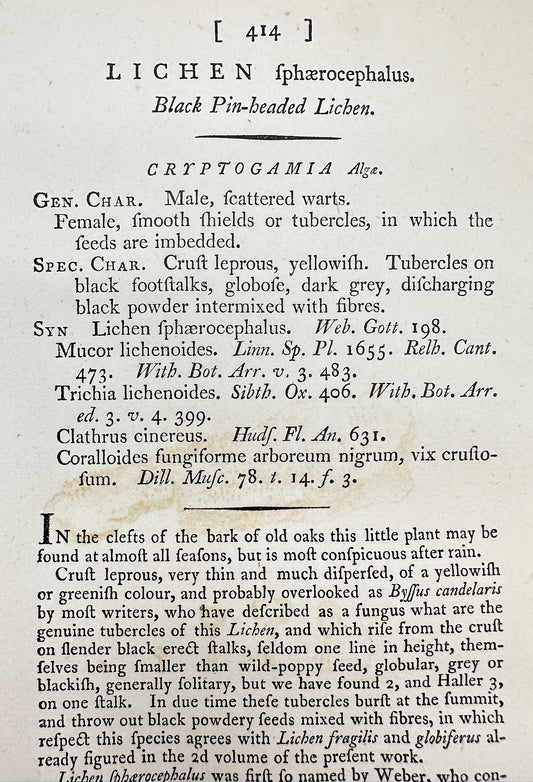 Antique Print - Sowerby - Lichen ſphærocephalus - Black Pin-headed Lichen - F1