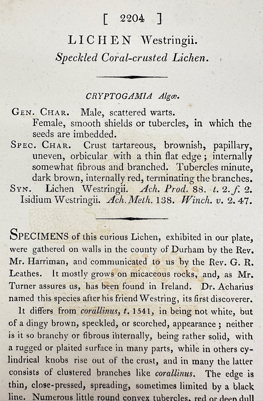 Antique Print - Sowerby - Lichen Westringii - Speckled Coral-crusted Lichen - F1