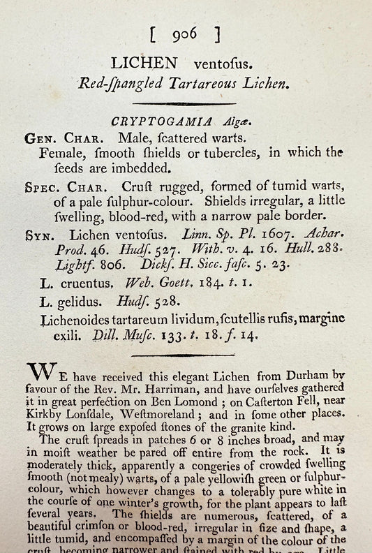 Antique Print - Sowerby - Lichen Ventofus - Red-Spangled Tartareous Lichen - F1