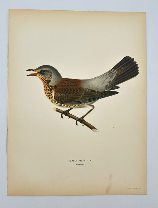 Antique Bird Print - Magnus von Wright - Turdus Pilaris - Fieldfare - F5