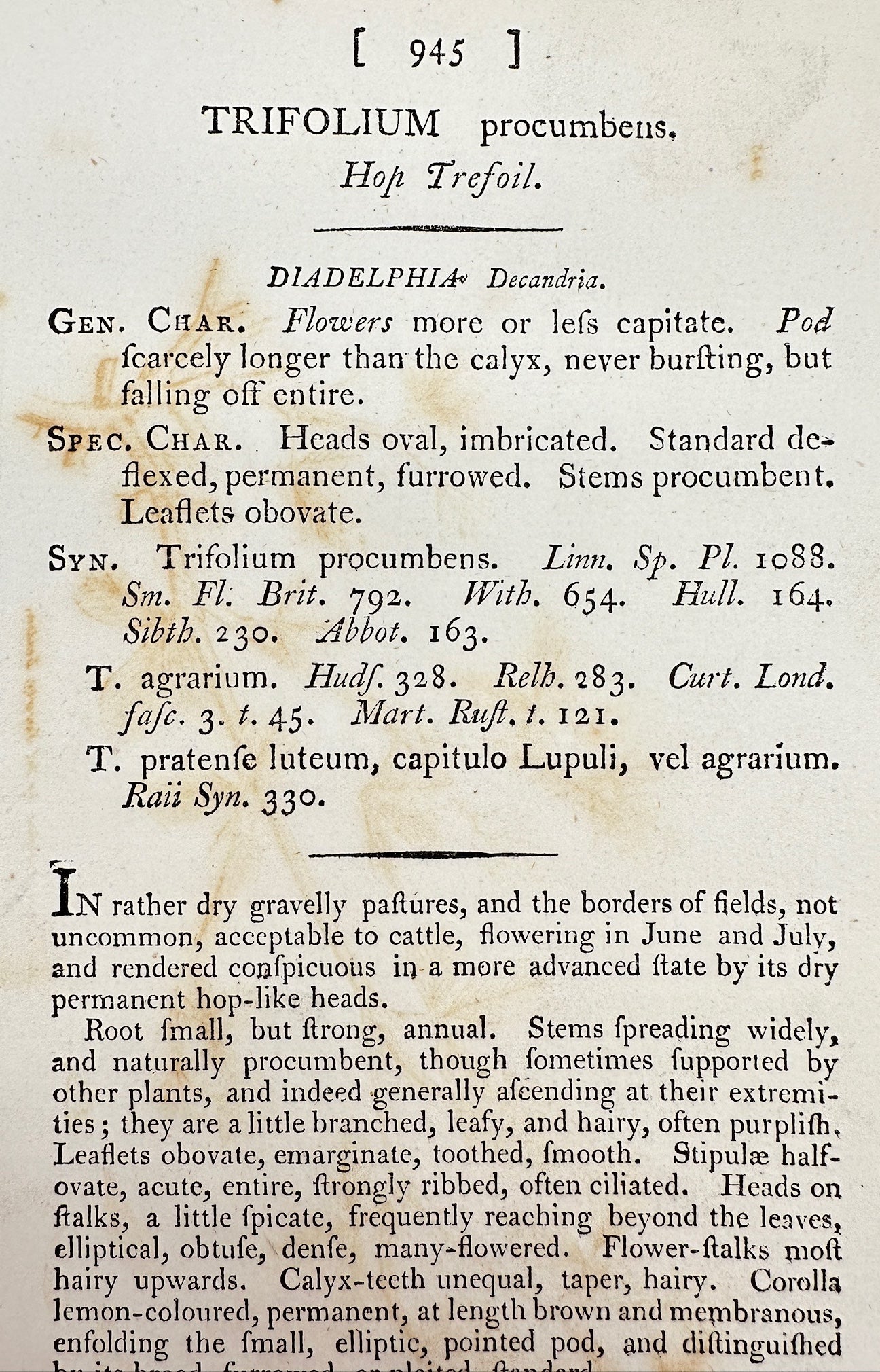 Antique Engraving - James Sowerby - Trifolium Procumbens - Hop Trefoil - F1