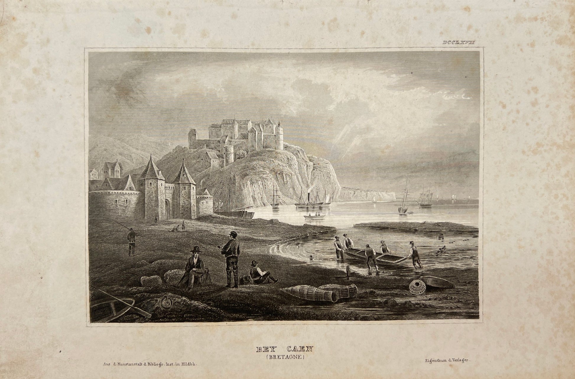 Antique Engraving - Karl Reiss - View of Bey Caen - Brittany - France - E5