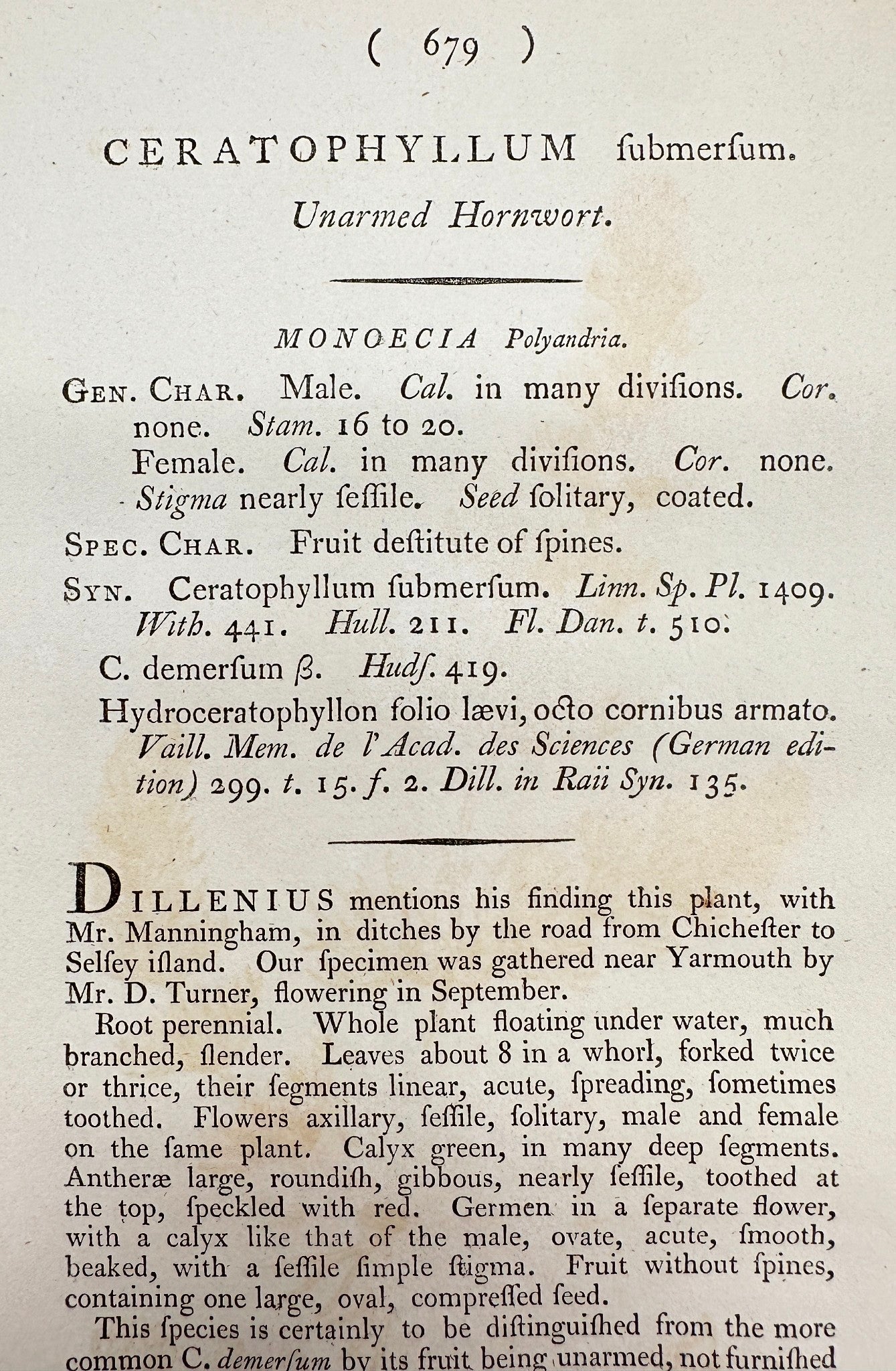 Antique Print - James Sowerby - Ceratophyllum Submersum - Unarmed Hornwort - F1