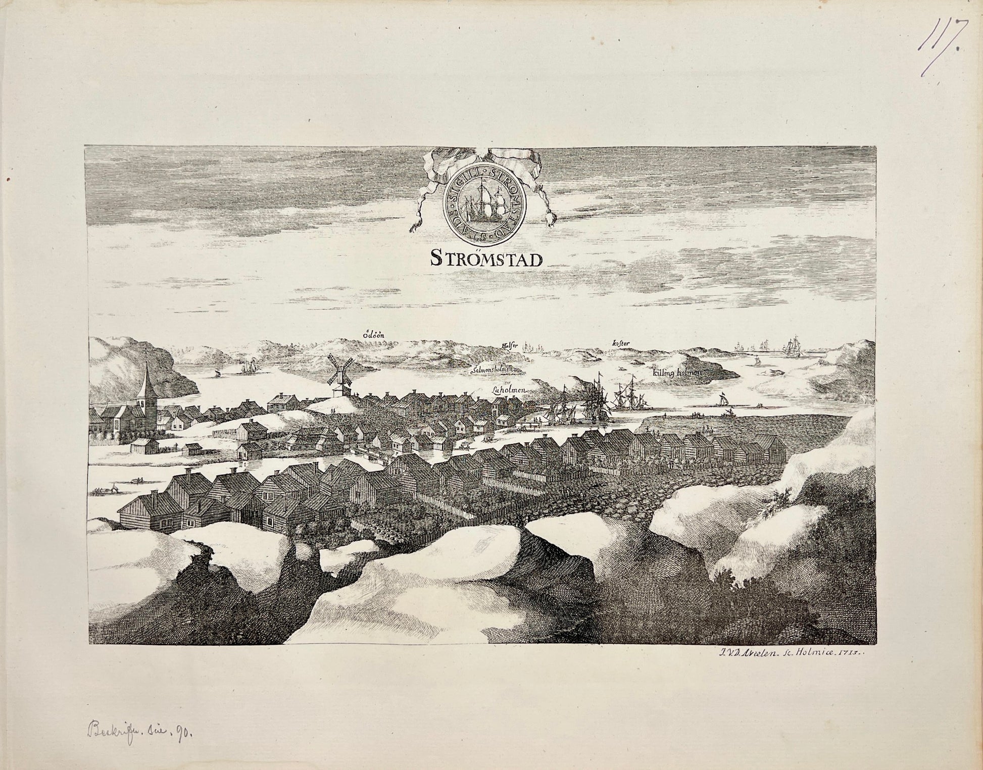 Original Antique Print - Erik Dahlberg - View of City of Strömstad - Sweden - E1